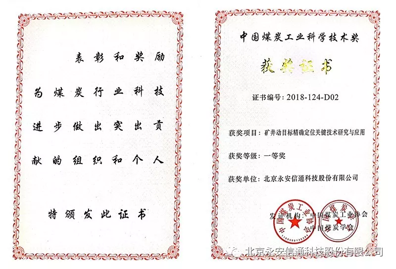 2018年9月16日,北京永安信通科技有限公司(以下简称“永安信通”)的“矿井动目标精确定位关键技术研究与应用”项目参加了中国煤炭工业协会科学技术奖的评审。经过应急管理部党组副书记、副部长付建华,中国煤炭工业协会会长王显政,副会长田会、刘峰,中国工程院洪伯潜、谢和平、王安、凌文、金智新等9位院士和多位专家学者的三级评审,永安信通获得了2018中国煤炭工业协会科技一等奖,该结果于2018年10月25日在国家煤炭工业网公示。